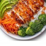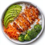 - Assemble the Bowls: Divide cooked white rice, steamed broccoli, shredded carrots, and avocado slices among four bowls.
