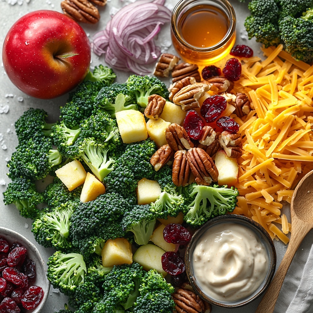 Start by gathering all your fresh ingredients in a large bowl. Combine the chopped broccoli florets, diced Honeycrisp apple, dried cranberries, chopped pecans or walnuts, finely diced red onion, and shredded sharp cheddar cheese if you’re using it. This colorful medley is the foundation of your salad, layering different flavors and textures that make each bite exciting.