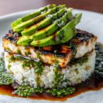 This Avocado Rice Stack recipe features tender grilled chicken breasts marinated in a zesty honey-lime sauce, served atop fluffy jasmine rice and crowned with a fresh, creamy avocado, red onion, and cilantro mix. The combination of vibrant citrus flavors, aromatic spices, and creamy textures makes this dish a refreshing and satisfying meal perfect for any occasion.