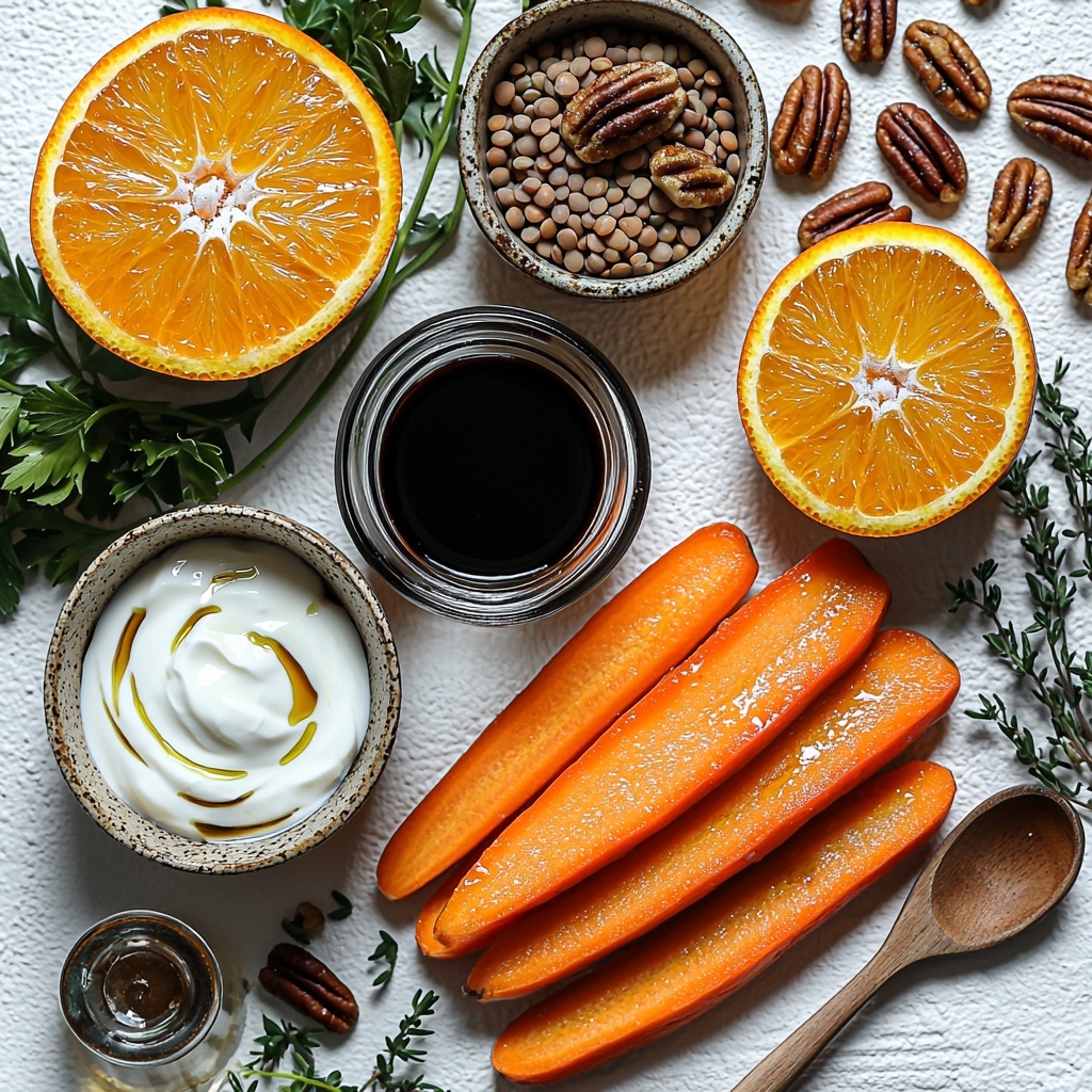 - Assemble the Dish: On each serving plate, spread a generous layer of the orange tahini yogurt sauce. Top with the crispy baked lentils, followed by the roasted balsamic carrots. Garnish with toasted pecans, fresh herbs, and a sprinkle of orange zest for a final burst of brightness.