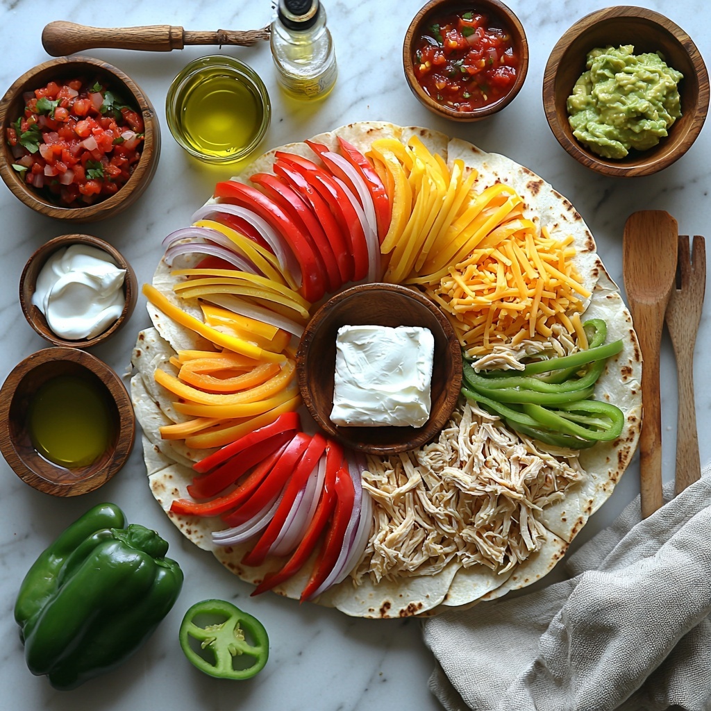 These ingredients come together simply but pack a powerful punch of flavor and texture. Each component plays its part, from the creaminess of the cheese blend to the fresh sweetness of the bell peppers, making the Blooming Chicken Quesadilla Ring Recipe a masterpiece of taste and color.