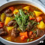 A hearty and comforting Braised Vegetable Beef Soup featuring tender chunks of beef chuck slowly braised with fresh vegetables, fragrant herbs, and rich beef broth. Perfect for a warming meal that combines deep flavors and nutritious ingredients.