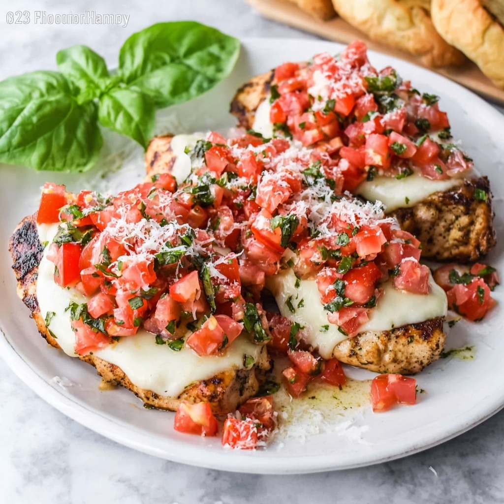 This Bruschetta Chicken recipe features juicy grilled chicken breasts topped with a fresh and vibrant bruschetta mixture of tomatoes, garlic, basil, and balsamic vinegar. Finished with melted mozzarella and a drizzle of balsamic glaze, this dish is a flavorful and elegant meal perfect for any occasion.