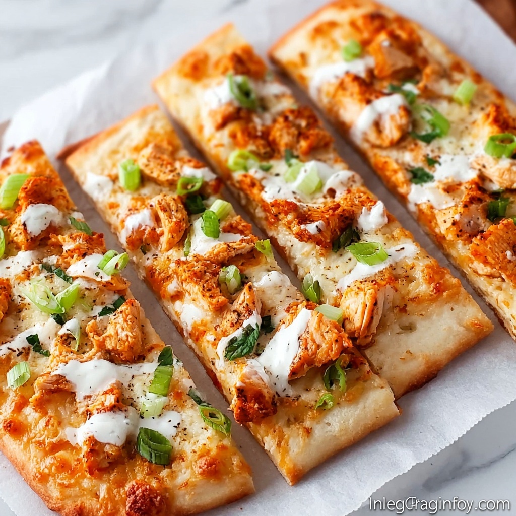 This Buffalo Chicken Flatbread is a quick and flavorful recipe perfect for a spicy snack or light meal. Featuring tender cooked chicken tossed in tangy buffalo sauce, melted mozzarella cheese, and creamy blue cheese dressing on a crispy flatbread crust, it offers a delightful combination of textures and bold flavors. Garnished with fresh green onions, it’s a simple yet irresistible dish that can be ready in under 30 minutes.