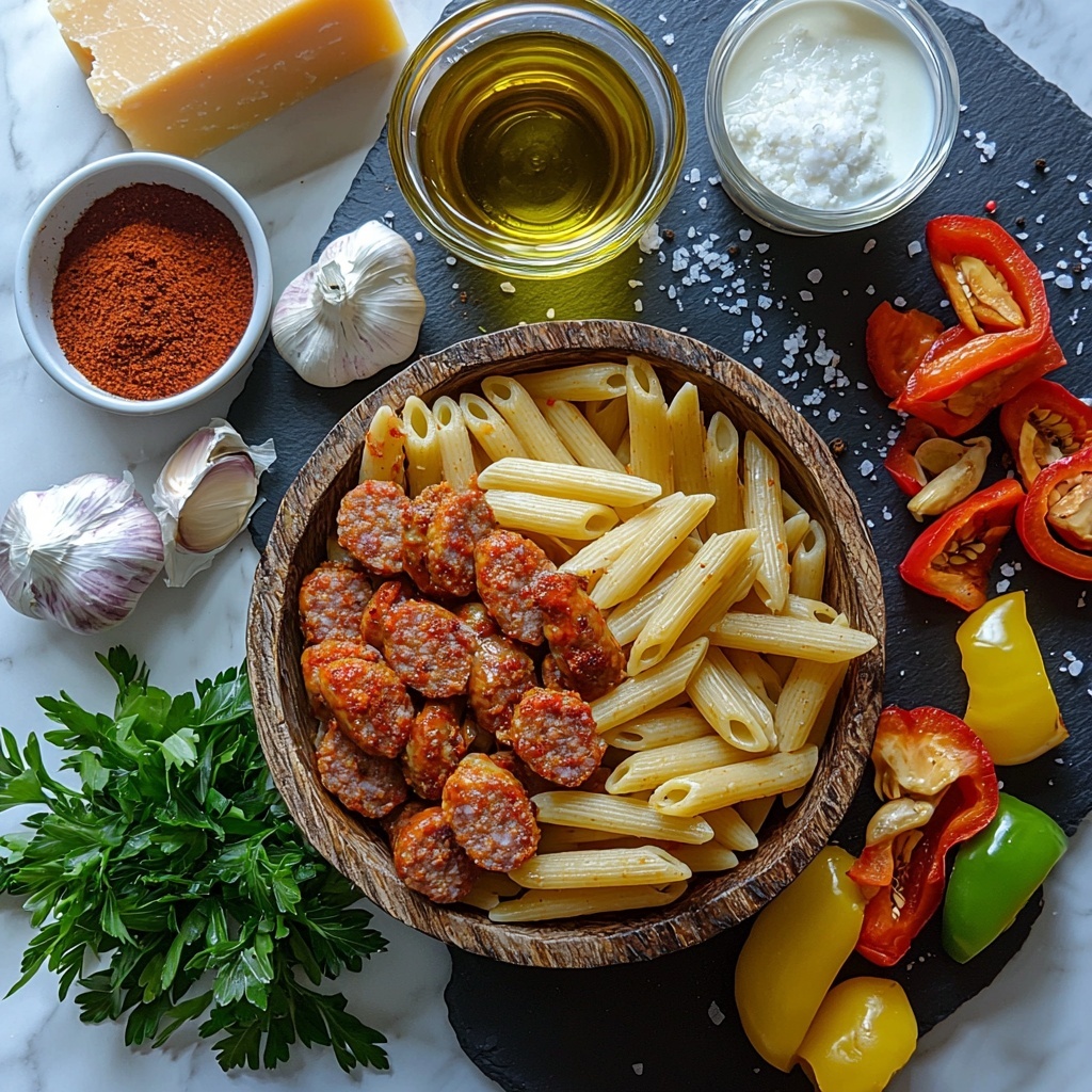 Gathering your ingredients is the first step to creating this vibrant and satisfying Cajun Sausage Pasta with Creamy Spicy Sauce Recipe. Each ingredient plays a crucial role in building layers of flavor, from the smoky sausage to the rich heavy cream, making this dish both simple and irresistible.