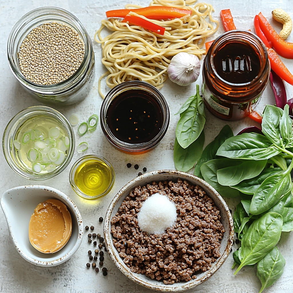 The beauty of this Caramelized Beef and Peanut Noodles Recipe is in its simple yet thoughtful ingredients list. Each element plays a vital role in building the perfect harmony of flavors, from the rich umami of teriyaki and soy to the zing of rice vinegar and the creamy touch of peanut butter.