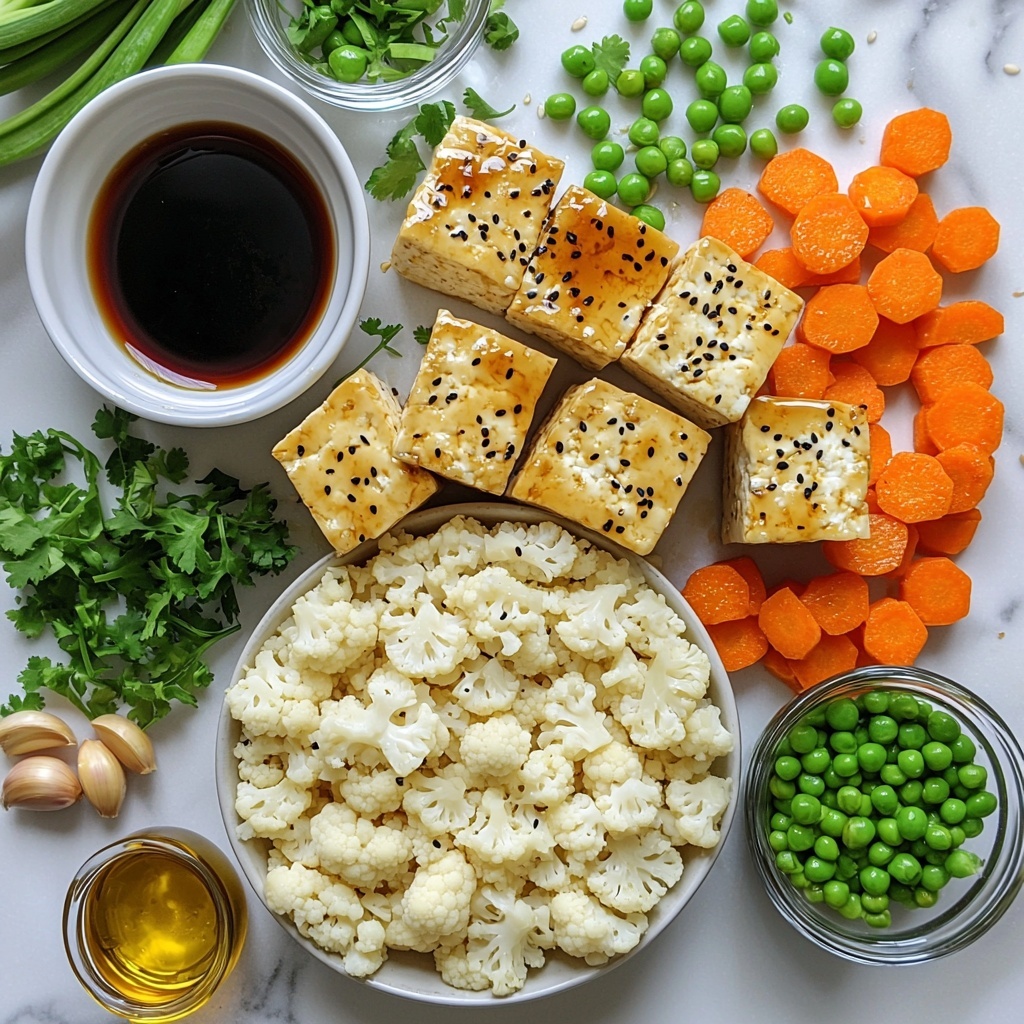 - Cook the cauliflower rice: Add the riced cauliflower to the skillet, stirring and cooking for about 5 minutes to allow it to soften slightly but maintain some texture. Then stir in frozen peas, cooked tofu, soy sauce, and sesame oil, mixing well to combine. Cook for an additional 2-3 minutes to heat through and meld flavors.