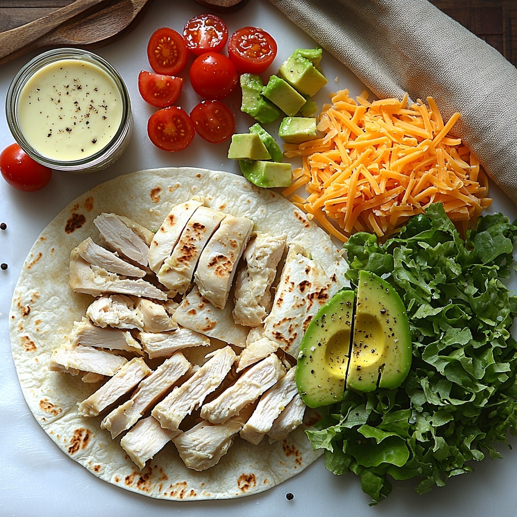 - Assemble Wraps: Lay the warmed tortillas flat on a clean surface. Spread a layer of shredded lettuce on each tortilla, leaving a margin around edges. Top with sliced or shredded chicken, then layer avocado slices, diced tomatoes, and shredded cheddar cheese evenly.