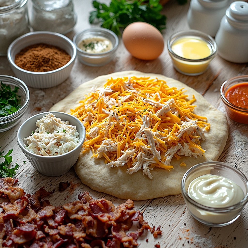 - Add Filling: Spread ranch dressing evenly over the dough, leaving a 1-inch border around the edges. Evenly layer the cooked chicken, crumbled bacon, shredded mozzarella, and cheddar cheese on top. Sprinkle the garlic powder and dried parsley over the filling.