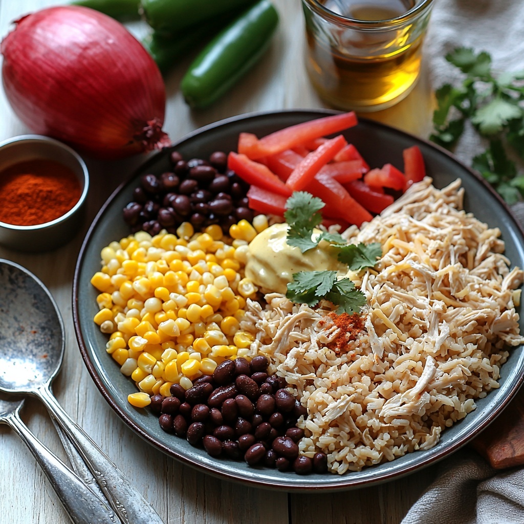 Pour your broth mixture over the vegetable and rice base in the baking dish, stirring to combine everything thoroughly. Then fold in the shredded cooked chicken, rinsed black beans, and frozen corn kernels. This ensures every bite of your Chicken Burrito Casserole Recipe bursts with layers of flavor and satisfying textures.
