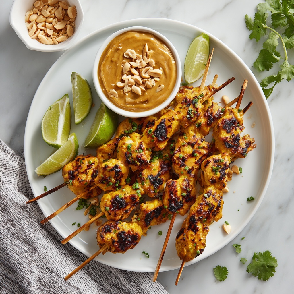 For a fun and informal presentation, arrange the skewers fan-style on a large platter with small bowls of peanut sauce scattered around for dipping. You can also make a vibrant satay bowl by layering grilled chicken, rice, crunchy veggies, and drizzling the peanut sauce on top. This Chicken Satay with Peanut Dipping Sauce Recipe is versatile and photogenic—perfect for sharing with family or friends.