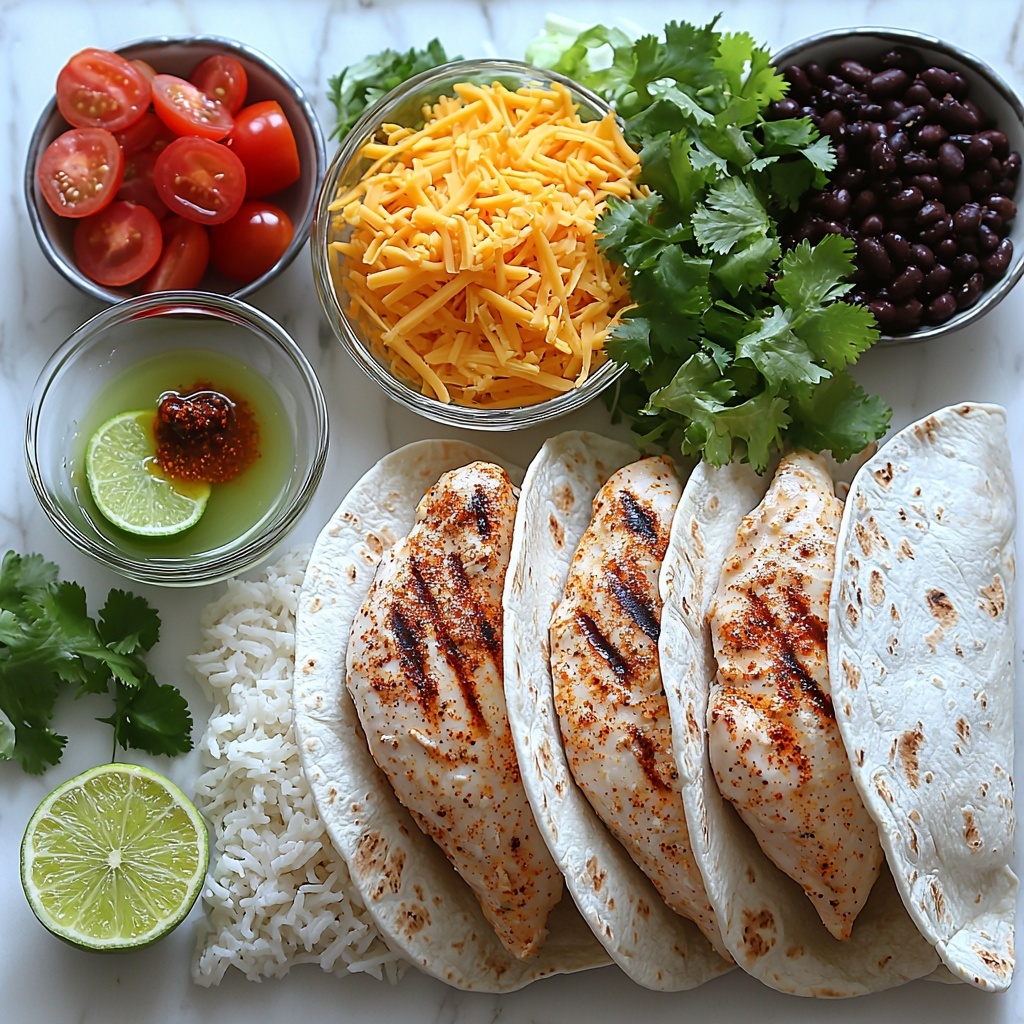 - Assemble the burritos: On each tortilla, layer cooked rice, black beans, grilled chicken strips, shredded cheddar cheese, diced tomatoes, shredded lettuce, and optionally sprinkle with chopped cilantro.