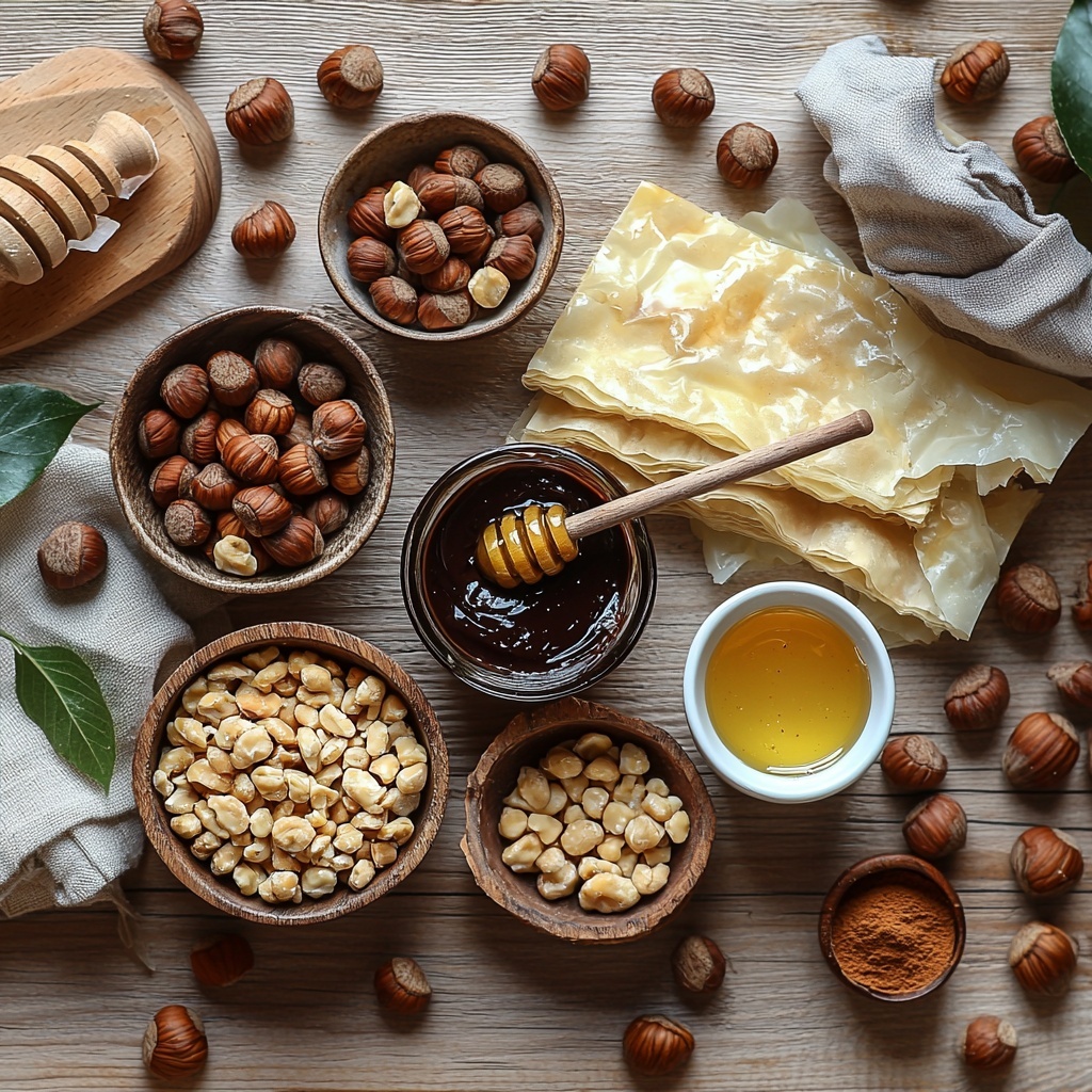 The magic of the Choc Hazelnut Baklava Tart Recipe comes from a handful of simple, thoughtfully chosen ingredients. Each one plays a vital role: crisp, golden phyllo layers create that signature crunch, while the trio of nuts brings texture and earthiness. The sugar and cinnamon add warmth and sweetness, balanced perfectly by the rich chocolate hazelnut spread. Finally, the honey syrup soaks into every bite, creating a sticky, satisfying finish you’ll love.