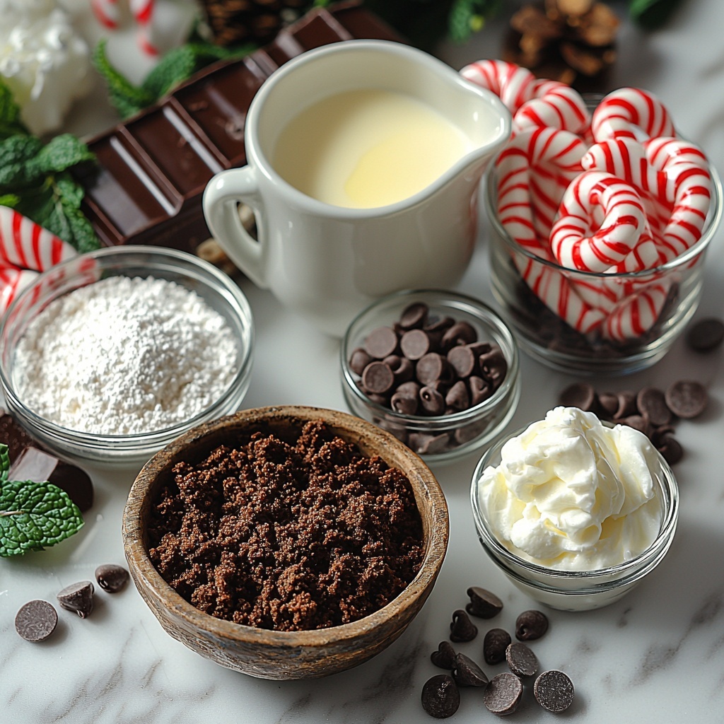 The ingredients for this tart are straightforward but vital to achieve that perfect balance of flavor and texture. Each one plays an important role—from the sturdy chocolate cookie crust to the smooth peppermint chocolate ganache and the delightful peppermint candy topping that adds crunch and holiday cheer.