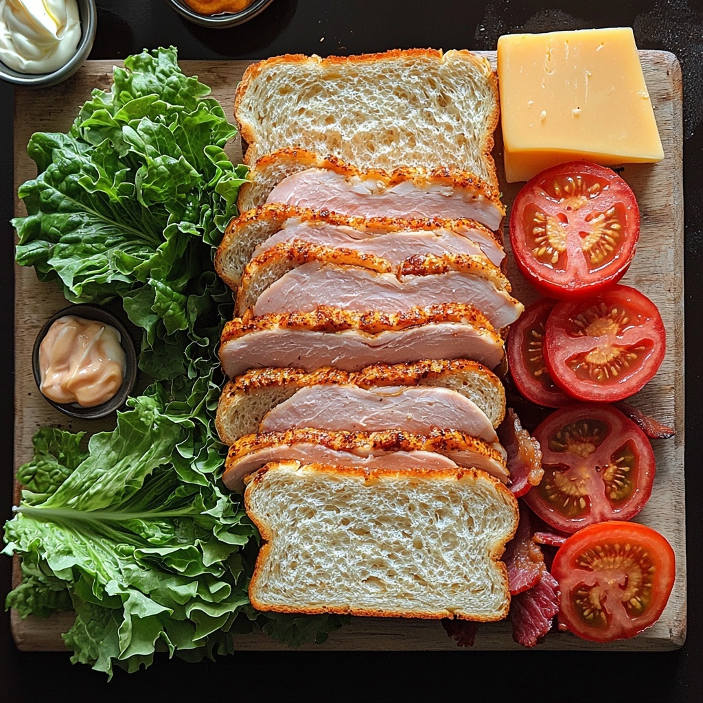 Classic and hearty Club Sandwiches featuring layers of turkey, ham, crispy bacon, fresh lettuce, tomato, and cheese between toasted bread slices, dressed with mayo and mustard for a delicious and satisfying meal.