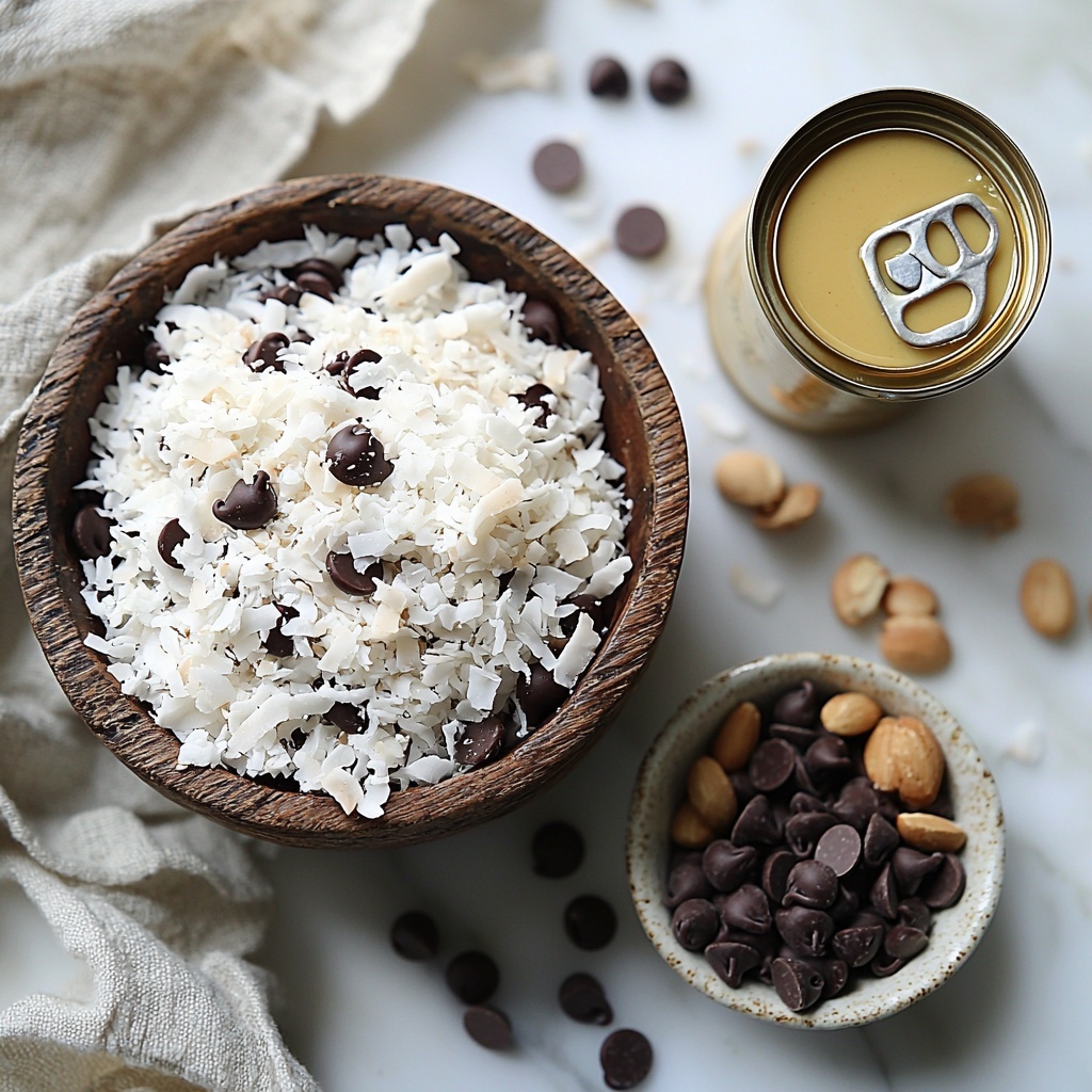 These no-flour coconut chocolate almond cookies combine sweetened coconut flakes, semi-sweet chocolate chips, and lightly salted almonds bound together with sweetened condensed milk. Baked to perfection at 325°F, these cookies feature a chewy texture with lightly golden edges, reminiscent of your favorite candy bar.