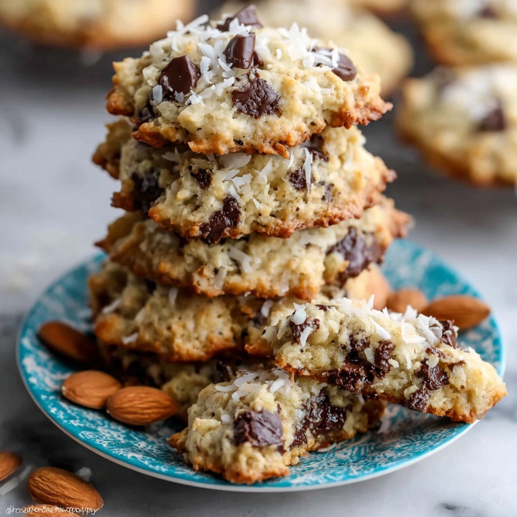 These no-flour coconut chocolate almond cookies combine sweetened coconut flakes, semi-sweet chocolate chips, and lightly salted almonds bound together with sweetened condensed milk. Baked to perfection at 325°F, these cookies feature a chewy texture with lightly golden edges, reminiscent of your favorite candy bar.