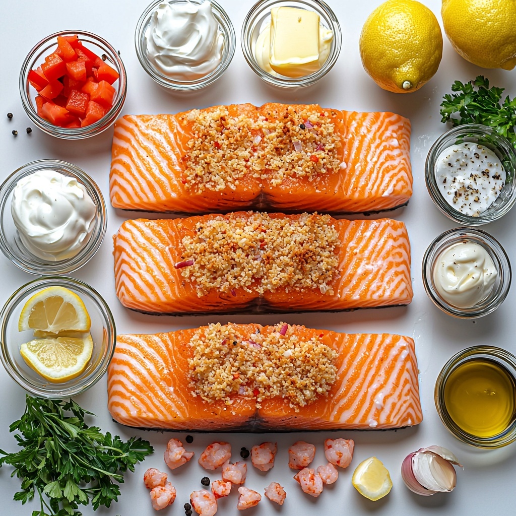 Gathering fresh, straightforward ingredients is the secret to nailing this dish. Each element plays a distinct role—from the succulent salmon fillets that serve as your canvas to the flavorful, creamy stuffing that brings everything to life. Preparing your ingredients thoughtfully will bring out the best in this Crab and Shrimp Stuffed Salmon Recipe.