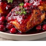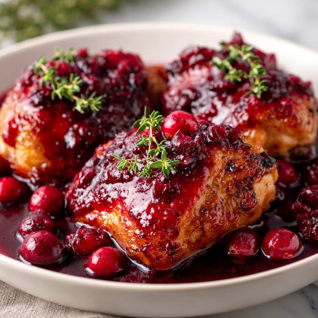 This Cranberry Glazed Chicken recipe features tender boneless chicken breasts coated in a vibrant, sweet-tart cranberry sauce. The chicken is first seared to a golden brown in a skillet and then baked in the oven with a flavorful glaze made from fresh cranberries, brown sugar, garlic, soy sauce, and fresh thyme, resulting in a delicious balance of savory and fruity flavors perfect for a comforting weeknight dinner.