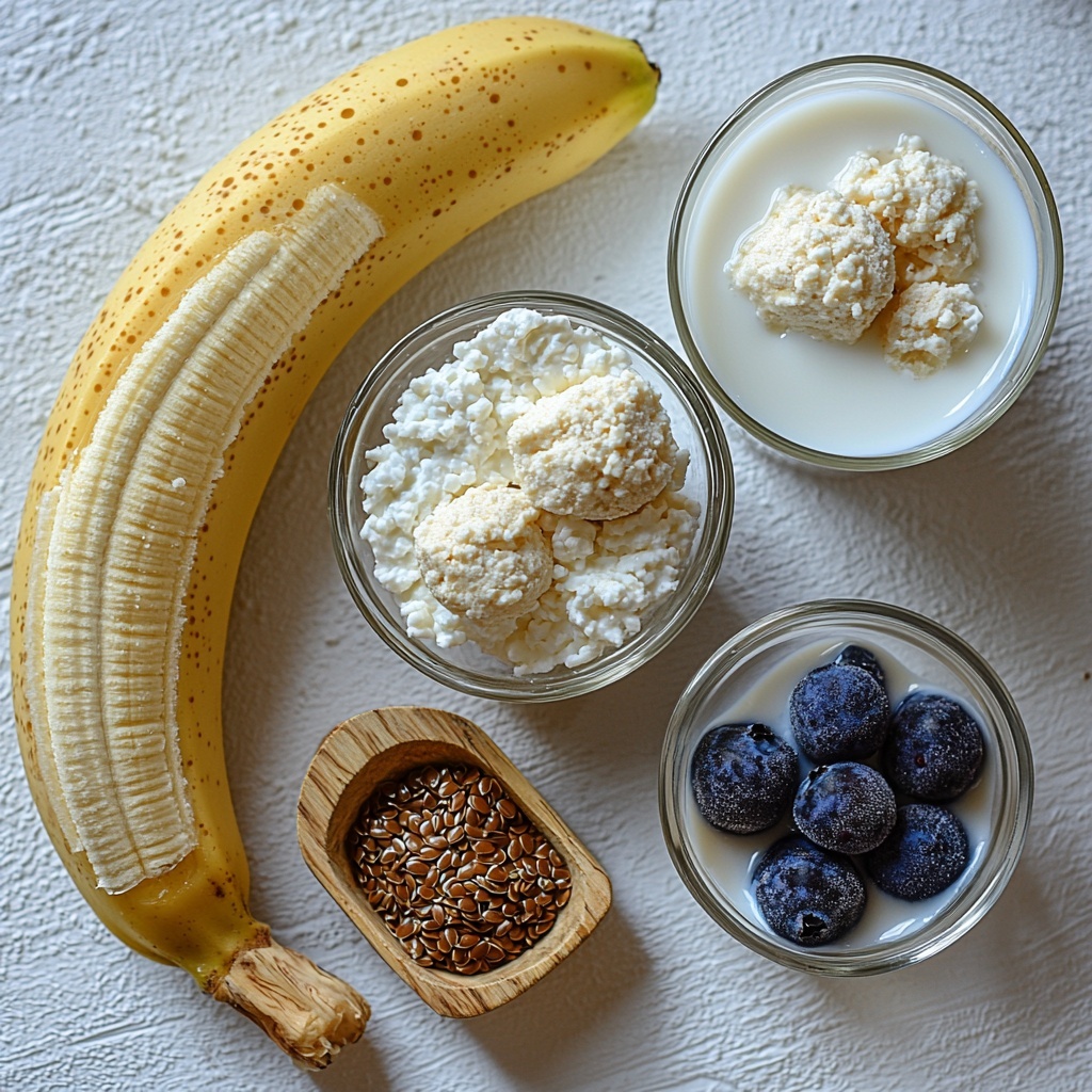 Start by adding the banana, cottage cheese, frozen blueberries, vanilla protein powder, optional flax seeds, and skim milk directly into a high-powered blender. Using frozen fruit keeps the smoothie refreshingly cold and thick without needing ice.
