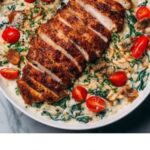 A creamy and flavorful Chicken Orzo recipe featuring tender chicken breasts sautéed with smoked paprika and Italian seasoning, combined with garlic, cherry tomatoes, fresh spinach, and a rich blend of heavy cream and basil pesto for a comforting one-pot meal.