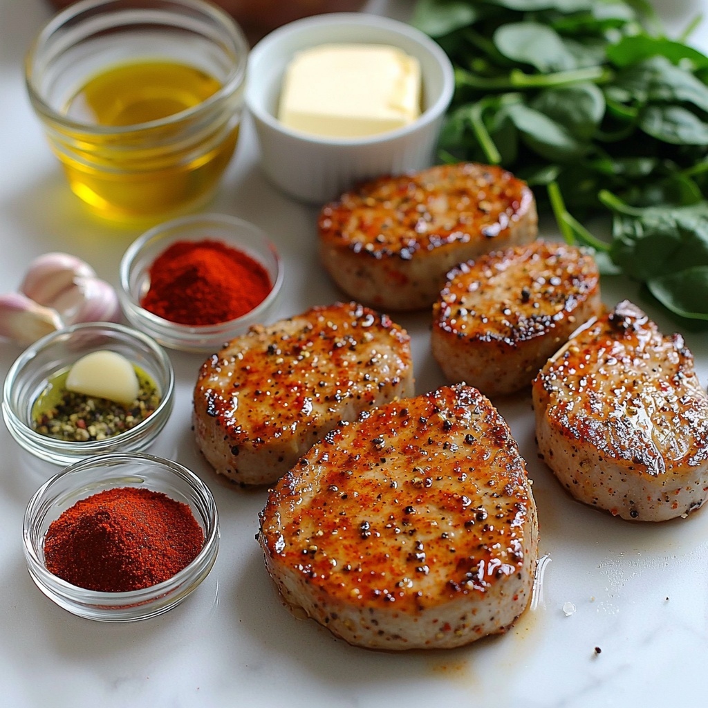 For a lovely presentation, arrange the pork chops atop a bed of creamy polenta or cauliflower mash, then drizzle the sauce and spinach over the top. Alternatively, serve everything family-style right from the skillet so everyone can help themselves—the rustic charm of this presentation adds to the cozy vibe perfectly. A wooden serving board with rustic bread on the side invites everyone to dig in and savor every bite.