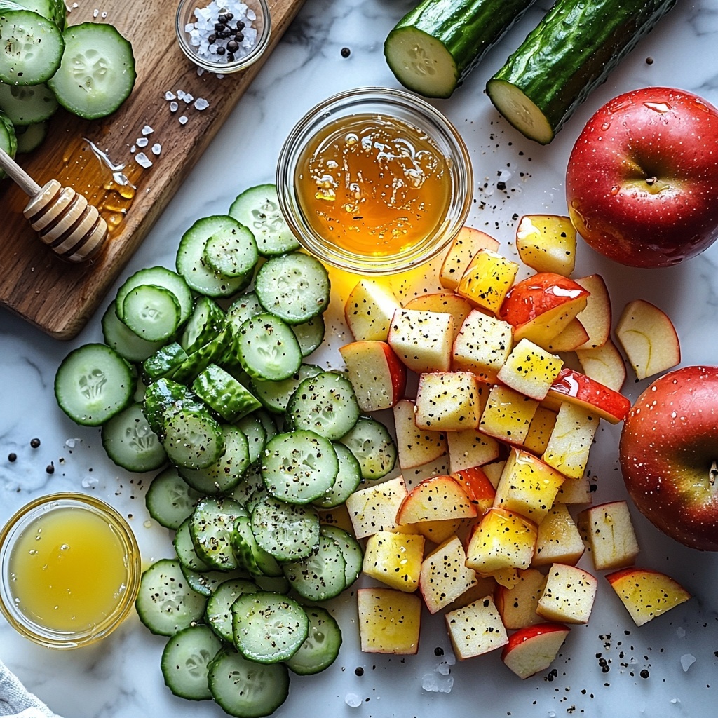 Gathering simple, fresh ingredients is what makes this salad shine. Each component plays a key role: cucumbers bring a cooling crunch, apples add a juicy sweetness, and the dressing offers a bright, tangy punch that ties everything together.