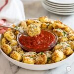 Remove your crispy tortellini bites from the oven and serve immediately with ½ cup of marinara sauce for dipping. To make them extra special, sprinkle freshly chopped basil and optional extra grated parmesan over the top. The freshness of basil balances the richness while the parmesan adds a final savory punch.