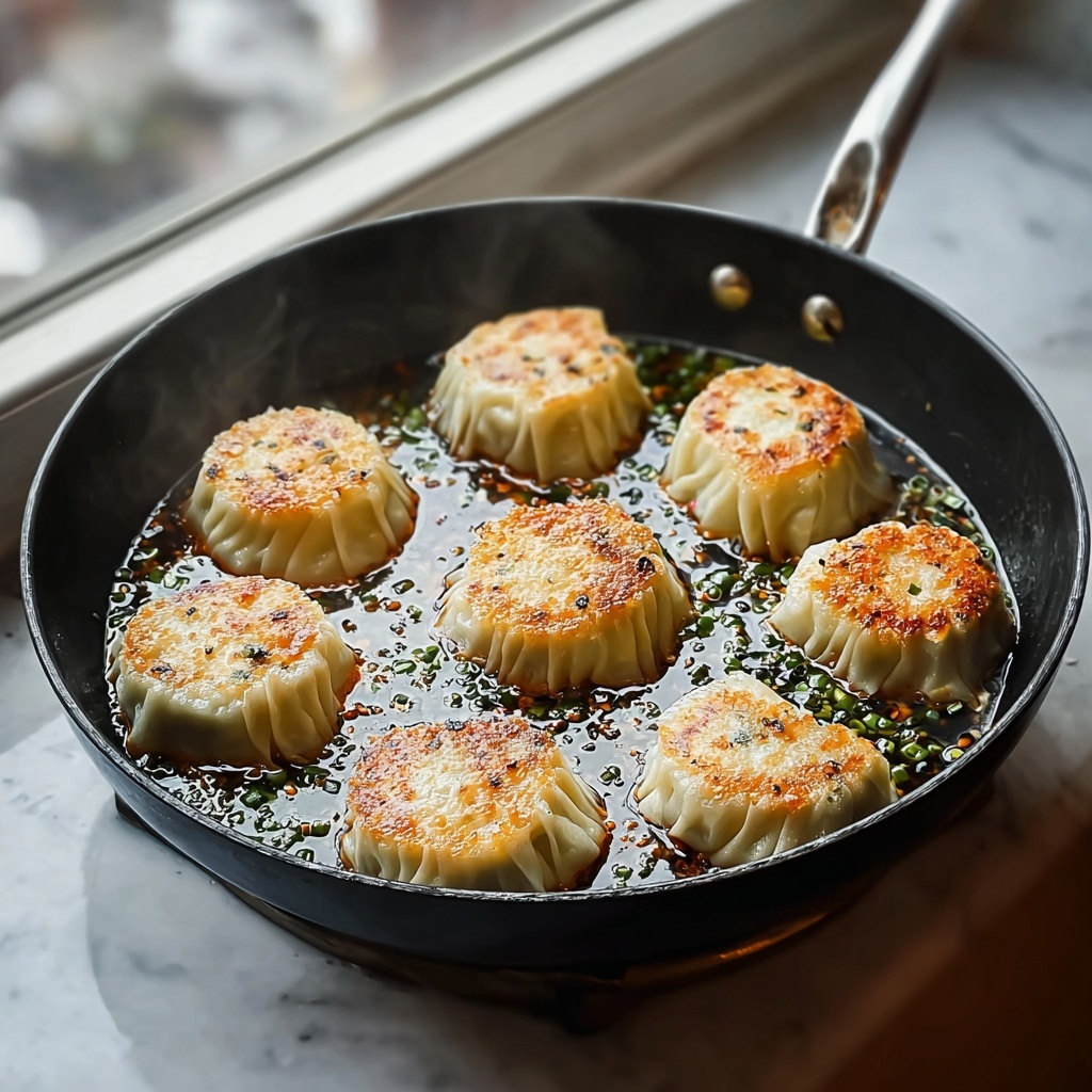 Heat oil in a skillet over medium heat. Place the dumplings in, making sure they’re not overcrowded, and fry them for 2 to 3 minutes until those bottoms turn a glorious golden brown. Next, add a splash of water to the pan—just enough to create steam—then quickly cover the skillet. Let the dumplings steam for 5 to 7 minutes to cook the filling completely and tenderize the wrappers. Finally, remove the lid and let them cook for another minute so the bottoms crisp back up, giving you that iconic texture contrast.