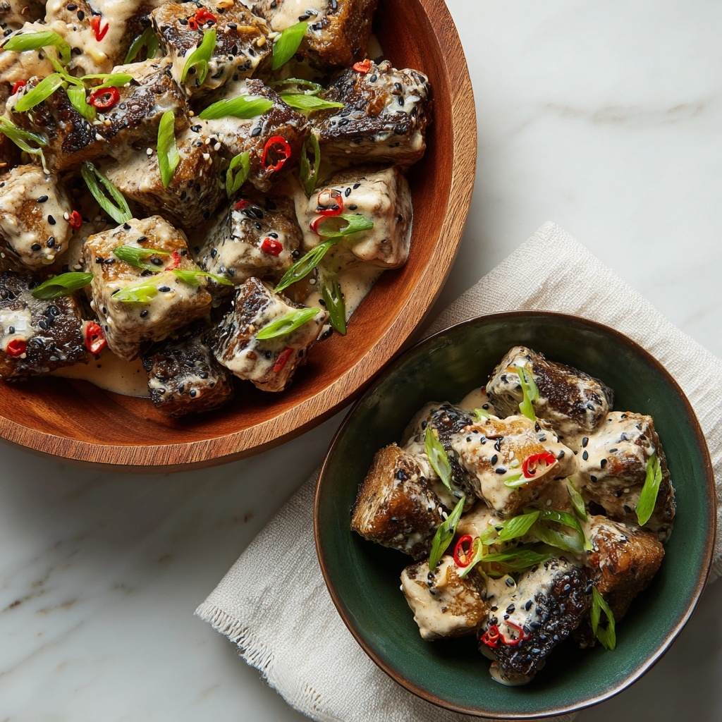 For a fun twist, serve these potatoes on a rustic wooden board garnished with colorful edible flowers or microgreens to add visual appeal. You could also transform the dish into a shareable platter by stacking the crispy pieces and drizzling extra dressing in a decorative zigzag pattern. Pair it with a bowl of the chilli crisp tahini dressing on the side for dipping to turn it into a crowd-pleasing appetizer.