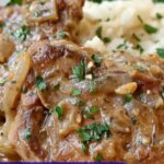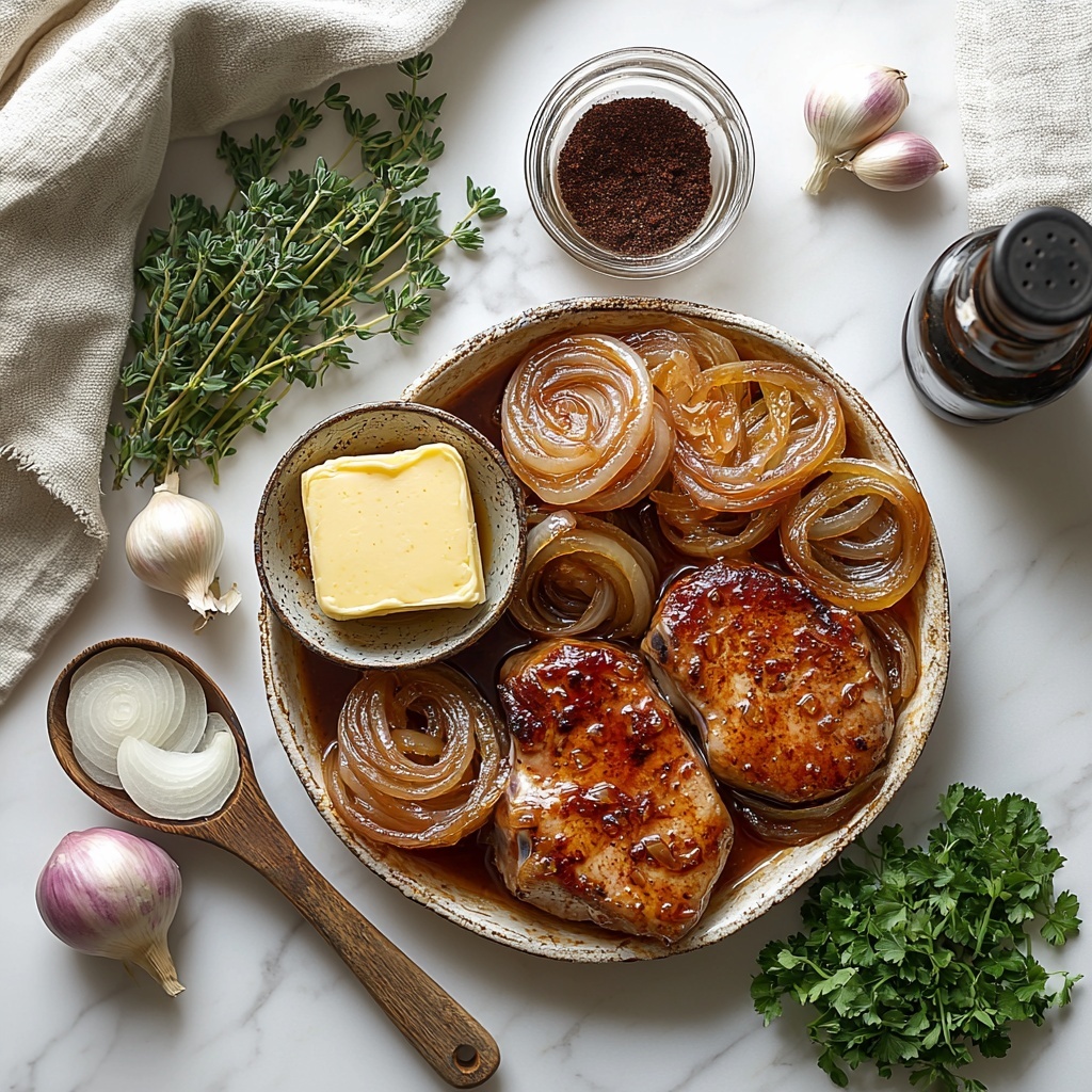 Tender bone-in pork chops slow cooked with caramelized onions, garlic, and a flavorful French onion gravy made from beef broth, Worcestershire sauce, and fresh thyme. This comforting Crock Pot recipe delivers juicy pork chops infused with savory flavors, finished with a rich homemade gravy and garnished with fresh parsley for an elevated meal.