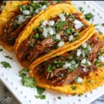 Freshness is key when garnishing birria tacos. Finely chopped white onion and bright cilantro add crisp texture and herbal brightness that beautifully balance the rich meat. Don’t forget a squeeze of fresh lime juice—this little burst of acidity cuts through the savory depth perfectly. For those who crave heat, a drizzle of salsa or hot sauce makes every bite even more exciting.