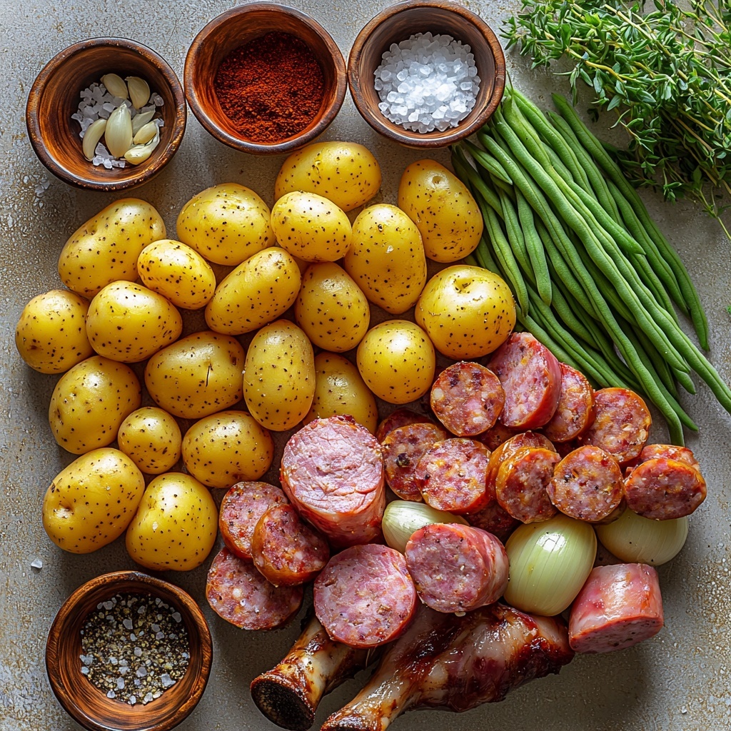 • Ham shank or ham/smoked sausage, 2 pounds: Provides smoky, savory richness that’s the heart of the dish.