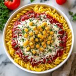 Next, add the cooked chicken on top of the pasta, then spoon the remaining ¼ cup of marinara sauce over the chicken. This keeps the chicken moist and flavorful, ensuring every mouthful is perfectly sauced.