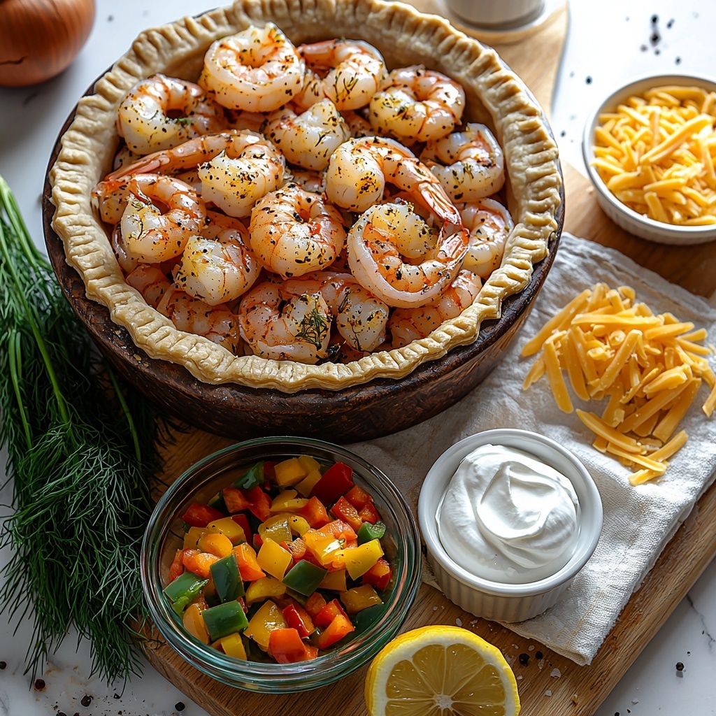 Florida Shrimp Pie is a savory seafood dish featuring succulent shrimp cooked with aromatic vegetables and herbs, all baked in a flaky pie crust with a creamy, cheesy filling. This comforting pie showcases fresh shrimp with bell peppers, onions, fresh dill, and sharp cheddar cheese, seasoned perfectly with Old Bay spice and lemon juice for a zesty Southern-inspired flavor.