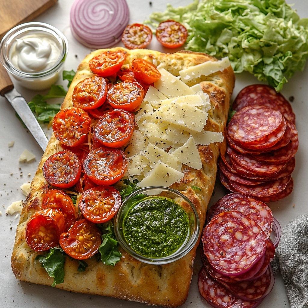 Spread the pesto generously over the bottom half of your focaccia—it’s the flavor base that really brings everything together. Next, layer your slices of uncured calabrese salame and capocollo evenly, making sure every bite will have a bit of that savory punch. Add the provolone cheese on top; its mild creaminess contrasts beautifully with the slightly spicy meats.