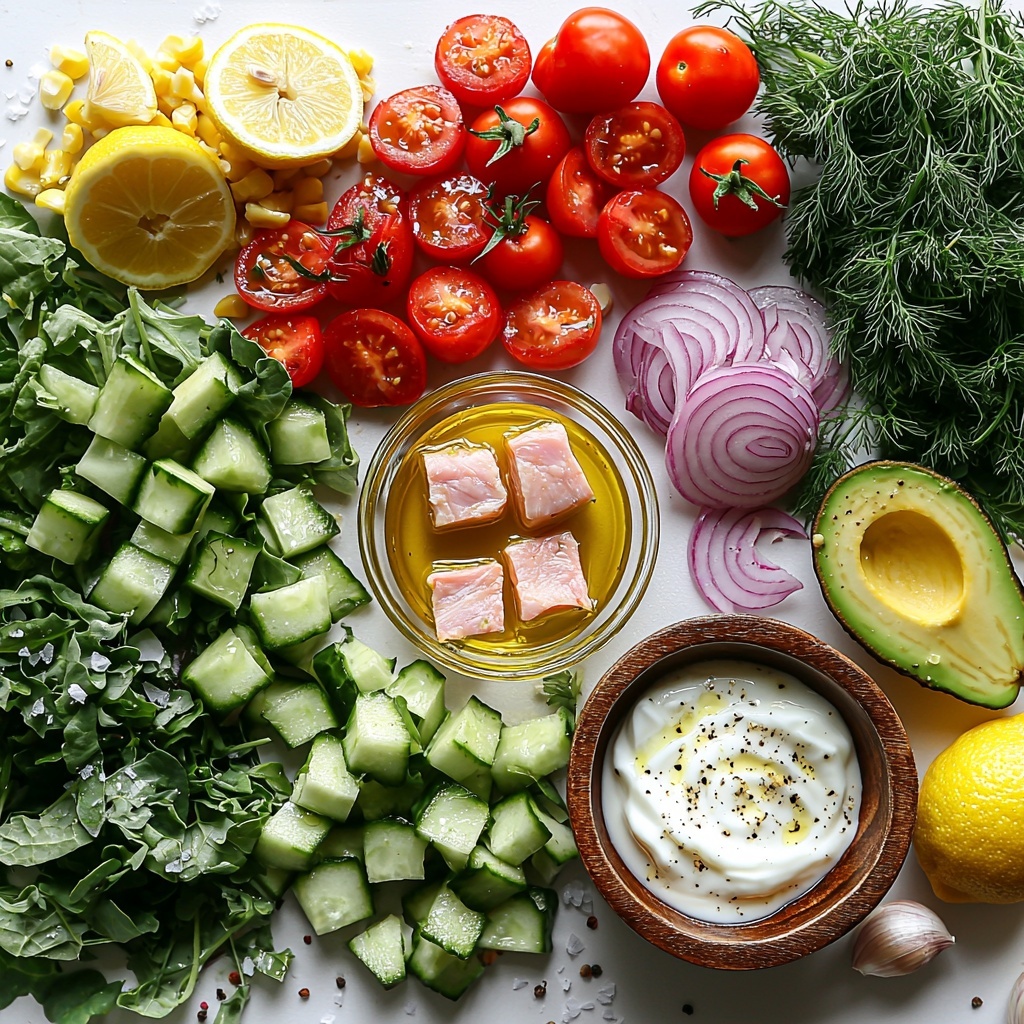 In a large bowl, combine your packed greens, red onion slices, halved tomatoes, chopped cucumber, creamy avocado slices, and sweet corn. Toss gently with the remaining homemade ranch dressing to bring everything together. The fresh textures and flavors mingle beautifully, making every forkful truly delightful.