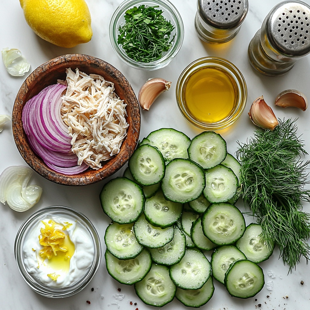 A refreshing and high-protein cucumber salad combining crisp cucumbers, tender chicken breast, and a creamy Greek yogurt dressing, enhanced with fresh herbs and bright lemon flavors. Perfect for a light yet nutritious meal boost.