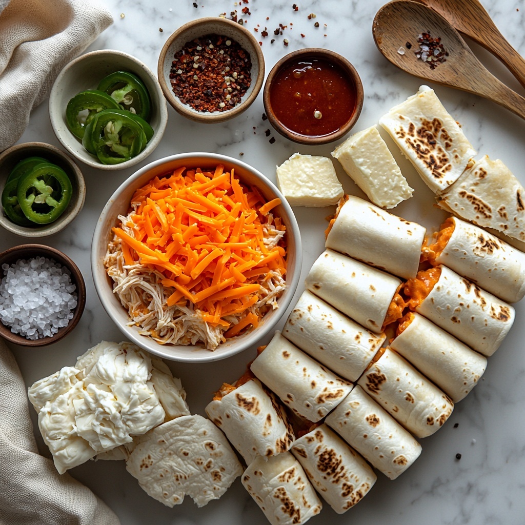 - Prepare the Filling: In a large bowl, combine the shredded cooked chicken, softened cream cheese, diced jalapeños, garlic powder, onion powder, salt, and pepper. Mix well to create a creamy, spicy filling.