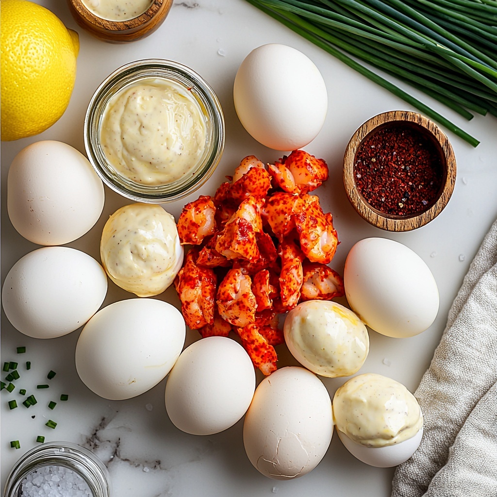 Gathering the right ingredients sets the stage for this Lobster Deviled Eggs Recipe. Each component is simple but essential, contributing to the creamy, tangy, and savory flavor profile while lending gorgeous color and texture to the final dish.