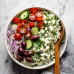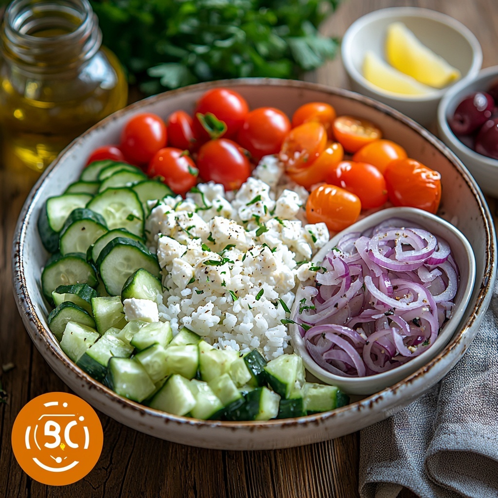 - Combine salad ingredients: In a large bowl, add the cooled rice, chopped cucumber, halved cherry tomatoes, thinly sliced red onion, sliced Kalamata olives, crumbled feta cheese, and chopped fresh parsley. Gently mix to distribute all the ingredients evenly.