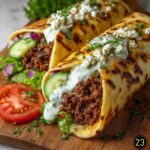 Spoon generous portions of the Mediterranean-spiced beef in the center of each tortilla. Top with chopped romaine lettuce, cucumbers, and tomatoes for fresh crunch and vibrant color. Then, drizzle the creamy feta sauce liberally over the top. Roll each wrap tightly and serve immediately while everything is warm and fresh.