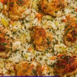 A comforting one-pan chicken and rice bake featuring tender chicken thighs cooked atop a bed of flavorful mirepoix-infused rice, all baked to perfection with Italian seasoning and buttery highlights, making for an easy, hearty, and delicious meal.
