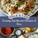 This Quick & Easy Creamy Smothered Chicken & Rice Dinner features tender seared chicken breasts or thighs cooked in a luscious, creamy sauce made from sautéed onions, garlic, cream cheese, and heavy cream. Served over fluffy white rice and garnished with fresh parsley, it’s a comforting, satisfying meal perfect for busy weeknights.