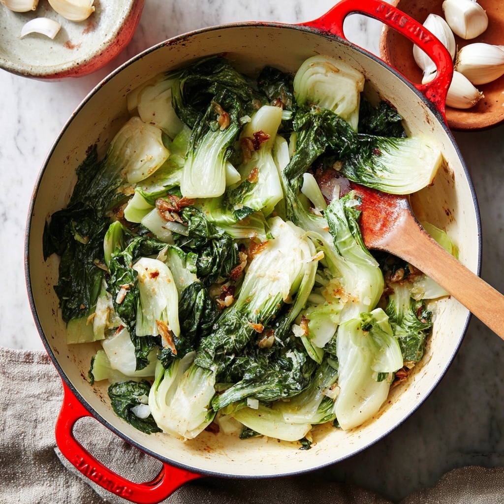 A quick and simple recipe for sautéed bok choy with garlic, combining tender stalks and wilted leaves in a flavorful soy-sesame sauce. This easy side dish is perfect for a healthy, vibrant addition to any meal, ready in just 15 minutes.