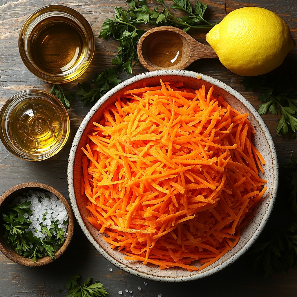 A fresh and vibrant raw carrot salad featuring grated carrots tossed in a tangy lemon and honey dressing, garnished with fresh parsley. This quick and easy salad is perfect for a healthy side dish or a light snack.