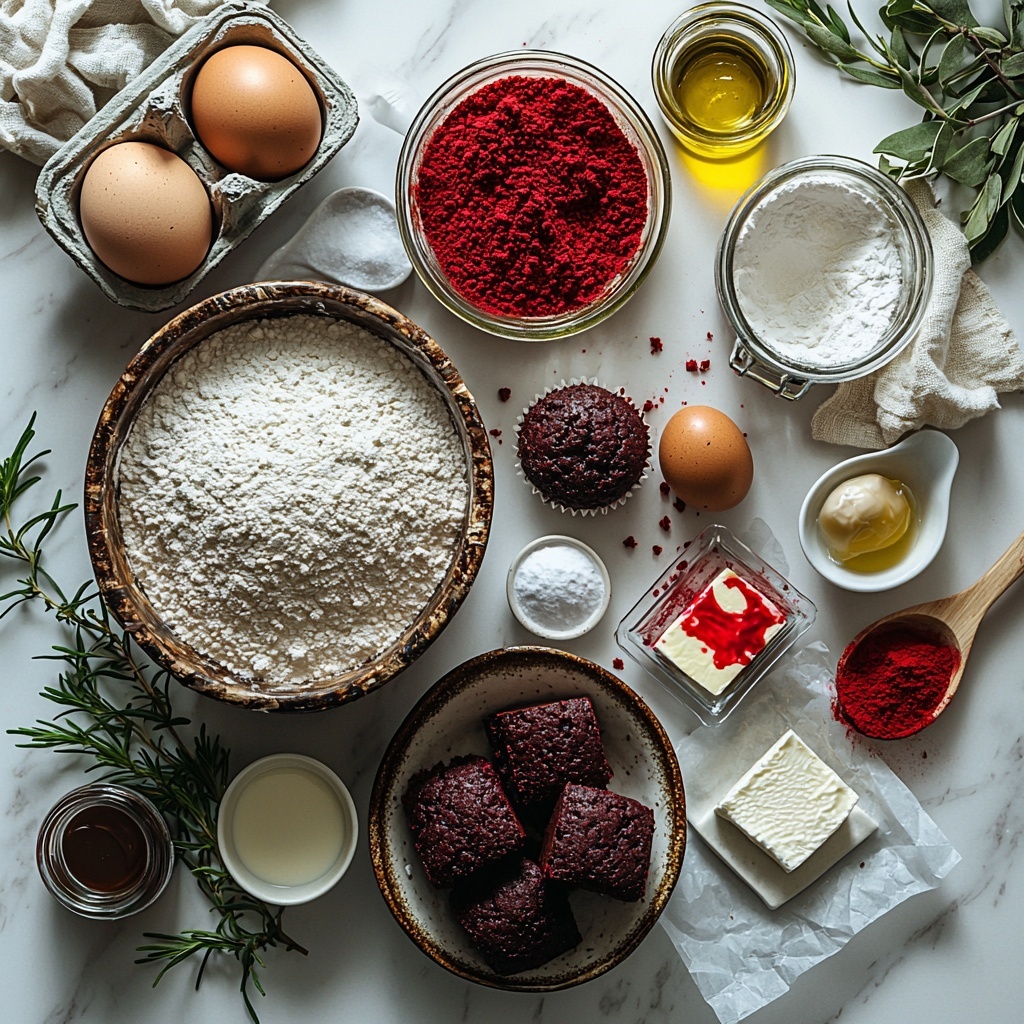 These ingredients are staples that come together to create the perfect balance of flavor, color, and texture in your muffins. From the rich red food coloring giving that signature hue to the cream cheese that makes the frosting luxuriously smooth, every item plays a crucial role.