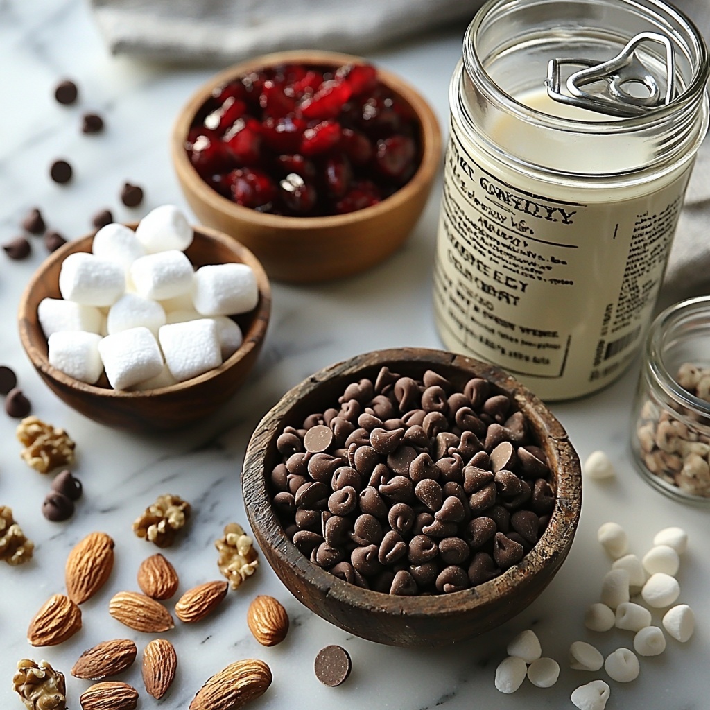 Believe it or not, the magic of this Rocky Road Christmas Fudge Recipe comes from just a handful of simple, yet essential ingredients. Each element plays a key role: from the creamy sweetness of condensed milk to the luscious depth of chocolate chips, and the festive pop that dried cherries add. Together, they create a balance of flavors that’s as beautiful as it is delicious.