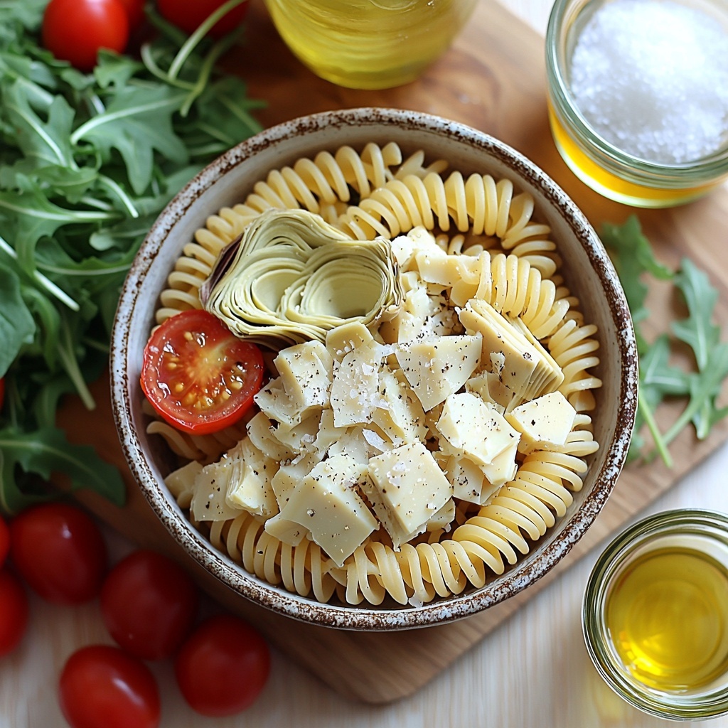 - Prepare dressing and combine: In a small bowl, whisk together the freshly squeezed lemon juice, extra virgin olive oil, salt, and pepper. In a large bowl, combine the drained pasta, chopped artichoke hearts, arugula, and halved cherry tomatoes. Pour the dressing over and toss gently to coat evenly.