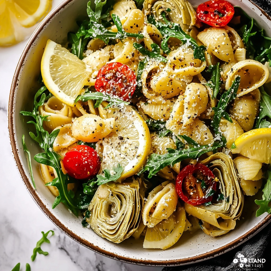 - Prepare dressing and combine: In a small bowl, whisk together the freshly squeezed lemon juice, extra virgin olive oil, salt, and pepper. In a large bowl, combine the drained pasta, chopped artichoke hearts, arugula, and halved cherry tomatoes. Pour the dressing over and toss gently to coat evenly.